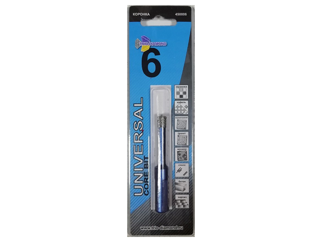 Алмазная коронка Trio Diamond Universal 6 мм — изготовлена по технологии выкуумной пайки. Диаметр коронки 5 мм. Используется для сухого сверления керамики, гранита, кирпича, керамогранита, мрамора, кафеля, кирпича, бетона и стекла. Коронка имеет шестигранный хвостовик. Коронка применяется для сверления в безударном режиме. Технический воск в теле коронки способствует увеличению ресурса.